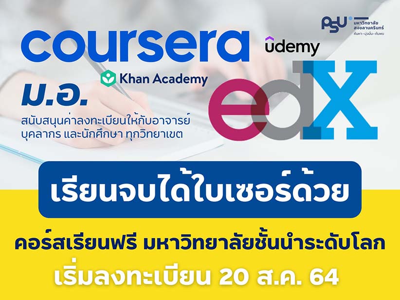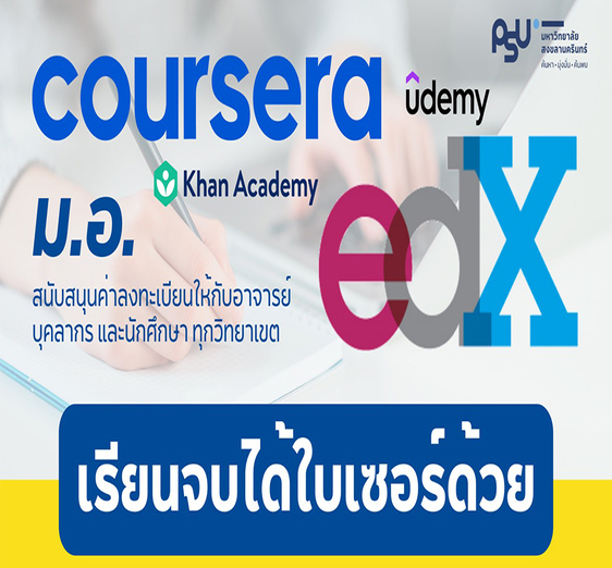 มหาวิทยาลัยสงขลานครินทร์ สนับสนุนการเรียนรู้ พัฒนาตนเอง กับคอร์สชั้นนำระดับโลก สามารถเลือกเรียนคอร์สที่อยู่ในระบบ edX, Coursera, Khan Academy และ Udemy เป็นต้น โดยการสนับสนุนค่าลงทะเบียน ภายใต้โครงการพลิกโฉมมหาวิทยาลัย (Reinventing University) ประจำปีงบประมาณ 2564 โดยการจัดสรรงบประมาณส่งเสริมการจัด World Class Self – Learning (MOOC)