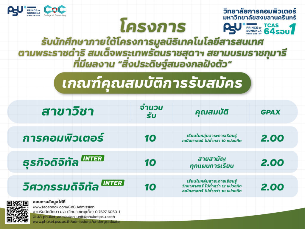 โครงการรับนักศึกษาภายใต้โครงการมูลนิธิเทคโนโลยีสารสนเทศ ตามพระราชดำริสมเด็จพระเทพรัตนราชสุดาฯ สยามบรมราชกุมารี (TCAS64/1) September 2, 2021September 14, 2021 onepsudt อ้างอิง https://computing.psu.ac.th/th/10954